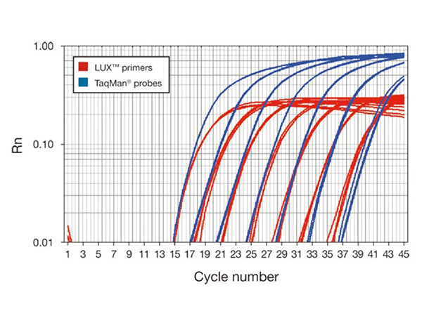 圖2.擴增曲線顯示了設置不當的基線 (A) 和設置正確的基線 (B)。閾值的設置Applied Biosystems?提供兩種閾值設置方法:自動和手動。自動設置中,軟件將自動選擇閾值,此閾值更適合平臺更高的曲線(圖3中的藍色曲線)。然而這將導致此數據組中的紅色曲線的 Ct 值出現偏差,因為其至佳閾值