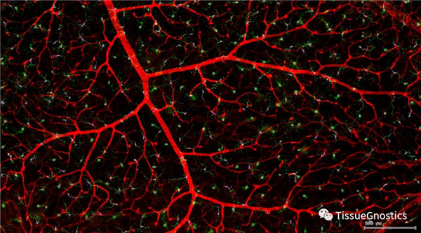 一般而言,眼底圖像通常都是通過激光掃描成像進行采集,但是由于眼底可觀測的視野往往是很有限的,一個患者的眼底信息需要多張掃描圖像才能完全顯示出來。這種局限性大大不利于病情進行全面的、細致的診斷。Tissue Cytometry全景組織流式定量分析技術進行全景圖像獲取,在單細胞、組織結構、細胞空間信息等多個層面進行定位、定性、定量分析。從而更好的對病變區域進行有針對性的跟蹤觀察和全面分析。
