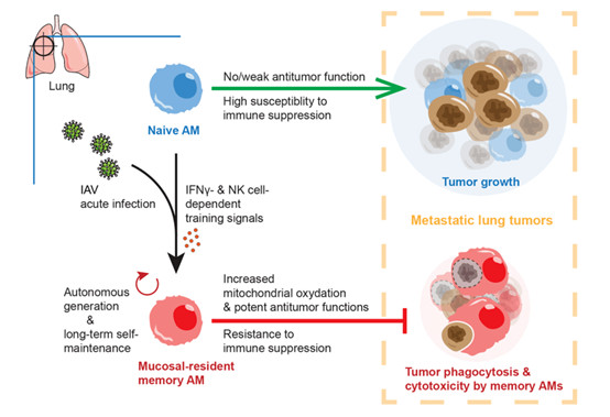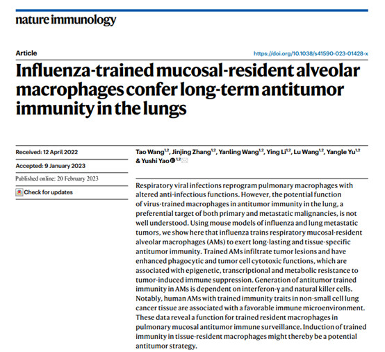 呼吸道病毒感染重塑了肺巨噬細(xì)胞的抗感染功能。然而,病毒訓(xùn)練的巨噬細(xì)胞在肺的抗腫瘤免疫中的潛在功能,一個(gè)原發(fā)性和轉(zhuǎn)移性惡性腫瘤的優(yōu)先目標(biāo),還沒(méi)有很好地理解。近日,浙江大學(xué)姚雨石團(tuán)隊(duì)在Nature Immunology (IF=31)在線發(fā)表題為“Influenza-trained mucosal-resident alveolar macrophages confer long-term antitumor immunity in the lungs”的研究論文,該研究利用流感和肺轉(zhuǎn)移瘤的小鼠模型表明流感訓(xùn)練呼吸道黏膜駐留的肺泡巨噬細(xì)胞(AMs),以發(fā)揮持久的和組織特異性的抗腫瘤免疫。訓(xùn)練的AMs浸潤(rùn)腫瘤病變,并增強(qiáng)吞噬和腫瘤細(xì)胞的細(xì)胞毒功能,這與腫瘤誘導(dǎo)的免疫抑制的表觀遺傳,轉(zhuǎn)錄和代謝抗性有關(guān)。在AMs中產(chǎn)生抗腫瘤訓(xùn)練免疫依賴于干擾素-γ和自然殺傷細(xì)胞。值得注意的是,在非小細(xì)胞肺癌組織中具有訓(xùn)練免疫特征的人類AMs與有利的免疫微環(huán)境相關(guān)。這些數(shù)據(jù)揭示了訓(xùn)練過(guò)的常駐巨噬細(xì)胞在肺粘膜抗腫瘤免疫監(jiān)測(cè)中的功能。因此,在組織常駐巨噬細(xì)胞中誘導(dǎo)訓(xùn)練好的免疫可能是一種潛在的抗腫瘤策略。