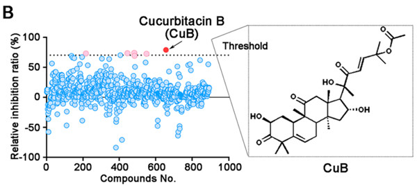 通過Biacore 8K的高通量抑制劑篩選實驗,作者得到了抑制劑篩選的排序。從圖2中可以直觀看出,六種具有較強抑制效果的天然產物被發現,其中抑制效果最強的當屬葫蘆素B(CuB)。在Huh增殖抑制實驗中,葫蘆素B同樣表現出了抑制作用,72h時的IC50達到1.0 uM。