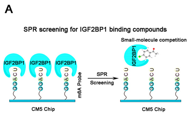 確定了治療靶點之后,作者使用Biacore 8K,直接從包含889種化合物的中藥天然產物庫中篩選能抑制IGF2BP1與其m6A靶點的活性分子。通過合成生物素標記的ss-m6A,作者將RNA直接固定在芯片上,將化合物固定濃度(20 μM)與IGF2BP1預孵育,檢測RNA與化合物- IGF2BP1的結合信號,從而直接篩選出具有抑制效果的天然產物(圖1)。