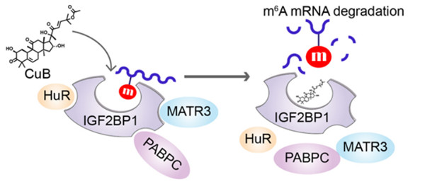 腫瘤免疫微環境(Tumor immune microenvironment ,TIME)調控因子IGF2BP1是一種關鍵N6 -甲基腺苷 (m6A) 閱讀蛋白,識別m6A靶點轉錄物,被認為是腫瘤治療的潛在靶點。2022年曾克武教授和屠鵬飛教授團隊發表的研究成果中,發現了天然產物葫蘆素B通過結合IGF2BP1發揮抗腫瘤作用,并且闡釋了作用機制。